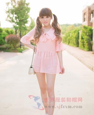 粉白細格的娃娃領連衣裙一雙白色的系帶坡跟皮鞋,背上一個白色的鏈條小包,扎上兩根可愛的羊角辮,這套粉白色的連衣裙與可愛的羊角辮搭配凸顯了麻豆的天真爛漫,讓初夏的空氣里都充滿了浪漫甜蜜的味道。