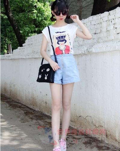 白色休閑t恤衫上印有女王圖案,搭配淺藍色高腰拉鏈短褲,搭配一柔粉色休閑鞋,背一款黑色單帶小包,戴一款黑色流行墨鏡,整體裝扮即休閑又舒適。