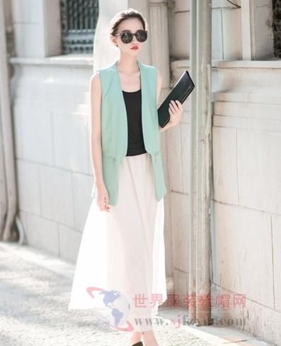 黑色的背心搭配薄荷綠的長款馬甲,白色的雪紡長裙搭配黑色的皮質高跟涼拖,拿上一個黑色的手包,戴上一副大框墨鏡,這身搭配顏色清新涼爽,既能凸顯個性還不失女人味兒。