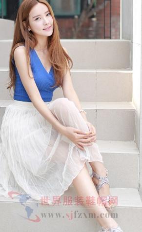 白色雪紡長裙能突顯脫俗氣質。寶藍色背心高貴華麗,v領設計隱約展現出傲人的事業線,性感迷人。