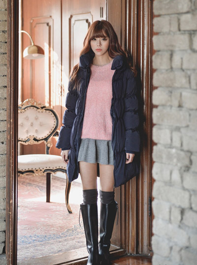 冬季除了黑色的外套穿,深藍色的外套也是很多MM們必穿的,很百搭的顏色,基本不挑搭配了!深藍色的羽絨服外套在冬季很養眼了,這款層疊版型的設計,穿在身上也不會胖胖的了,長款的版型搭配上長筒襪和長靴,很迷人了,再選擇內搭上粉色的毛衣和條紋連衣裙,格外的時髦溫暖了!