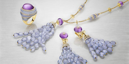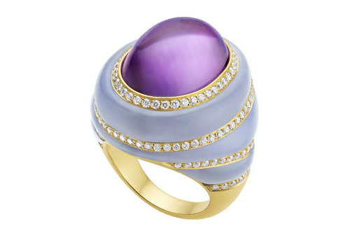 SPINDLE系列的創作靈感來自獨樹一幟的高級珠寶。玉髓搭配紫水晶和黃水晶,締造出柔和的色彩效果,而在密鑲鉆石的烘托下,光影流竄,美得教人屏息。所有寶石皆采用凸圓形切割,以彰顯寶石的圓潤形狀及其整體造型的立體意象,而且佩戴起來有一份女性嫵媚的溫柔氣質,優美而流麗。