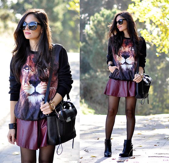 衛衣一直是秋冬搭配好伙伴,衛衣搭配皮裙帥氣不失女人味,尤其是這款深紅色的皮裙,讓獅子頭衛衣顯得霸氣可愛。