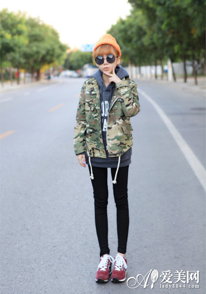 迷彩是今年時裝周上受關注的一個流行元素,迷彩外套內搭灰色稍長款連帽衛衣,黑色打底褲,紅色休閑鞋,橙色毛線帽讓整體造型更搶眼球,休閑感、存在感十足。