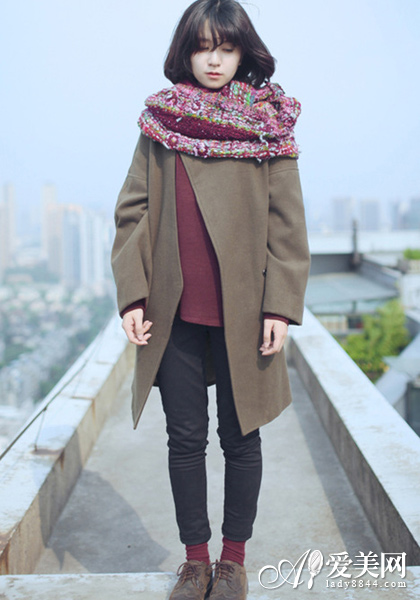 咖啡色不規則開門襟大衣體現至上的剪裁品質,內搭簡約酒紅色衫,黑色九分牛仔褲加短襪,與大衣同色系休閑鞋,民族風圍脖,整體色塊的碰撞、拼接恰到好處,文藝又森林系的氣息在彌漫。
