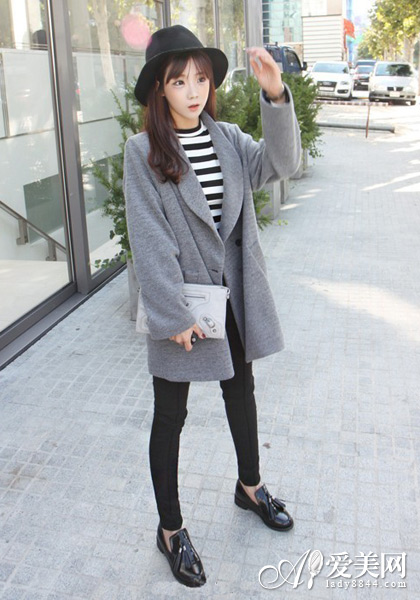 灰色BF西裝款式外套,內搭黑白高領條紋上衣,黑色打底褲,黑色流蘇牛津鞋,寬檐帽的加入更把造型塑造出范兒來,簡約時尚。