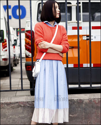 橘色與藍色的互補色調為視覺帶來無限沖擊感,寬松的粗線毛衣為整身搭配帶來溫暖的舒適感,讓內搭的學院風藍色襯衫裙顯得悠閑自在。寬松的毛衣款式可以遮掩上半身的缺陷,小肚腩和和水桶腰統統不見。下擺長過膝的連衣裙也能很好的拉長下半身比例,瞬間變身超模九頭身完美身材。