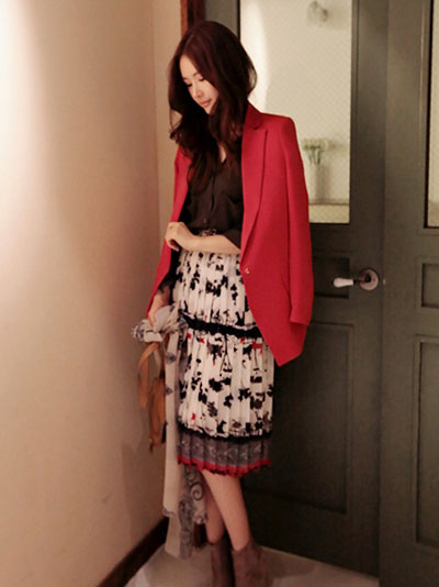 紅色的西裝外套很是艷麗呢,寬松的款式很藏肉顯瘦,經典的板型設計很百搭呢,黑色的基本款式襯衫內搭,印花的高腰長裙搭配上短靴,這樣一身搭配也很顯優雅氣質,再加上青色的印花圍巾,很迷人!