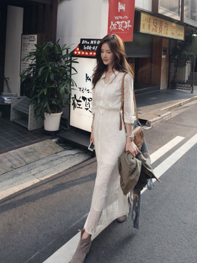 復古風格的長裙很是迷人呢,襯衫裙子的款式很大方知性呢,搭配上短靴,讓MM們穿出完美九頭身來,民族風印花圍巾搭配上軍綠色的短款外套,這樣一身搭配優雅浪漫十足呢!