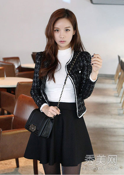 黑色小香風短外套搭配白色修身針織衫,下穿黑色傘裙,是不是很簡單的搭配,經典不敗的黑白配,干練時髦。而且還能視覺增高呢,看著就完全符合人體審美觀。
